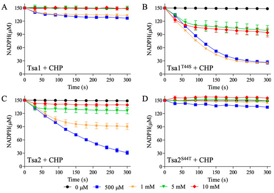 Inactivation of yeast Tsa1, Tsa2, and mutants by CHP. Similar to Figure 2, S. cerevisiae Tsa1 (A), Tsa1T44S (B), Tsa2 (C), or Tsa2S44T (D) were treated with growing amounts of CHP and the absorbance of NADPH was monitored at 340 nm. The experiment was executed with 1 µM Prx, 2 µM Trx1, 0.3 µM TrxR1 and increased amounts of CHP (0 µM = ● black, 500 µM = ■ blue, 1 mM = × orange, 5 mM = ▼ green and 10 mM = ♦ red) in buffer containing 50 mM HEPES pH 7.4, 100 μM DTPA, 1 mM sodium azide, and 150 µM NADPH. Error bars represent the standard deviations. All the experiments were performed in triplicate and repeated at least three times with similar results.