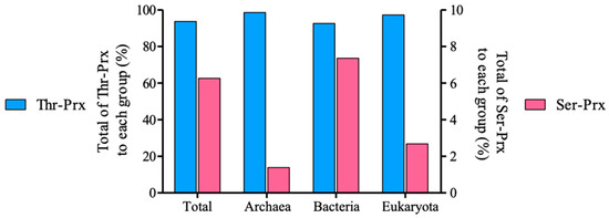 As the presence of Ser or Thr provokes dramatic alterations in the biochemical and structural properties of yeast 2-Cys Prx, we investigated the phylogenetic distribution of Ser-Prx and Thr-Prx. We analyzed 45,939 unique protein sequences, out of which 15,034 accessions presented AhpC-TSA, Redoxin and 1-CysPrx_C domains denominations according to Pfam and no other domain fused, except for SCO1-SenC. Out of the sequences with taxonomic annotation at domain level, Thr-Prx represented the majority (14,092 sequences, approximately 93.7%), whereas the remaining (941 sequences, approximately 6.3%) are Ser-Prx (Table 3). Notably, the proportions between Thr-Prx and Ser-Prx are different in the three domains of life. Ser-Prx sequences are proportionally more representative in bacteria (7.4%) compared to eukaryotes (2.7%) and archaea (1.4%) (Figure 4). We also found 45 Thr-Prx records deposited in the NCBI database obtained by metagenome approaches and three of them were uncategorized.