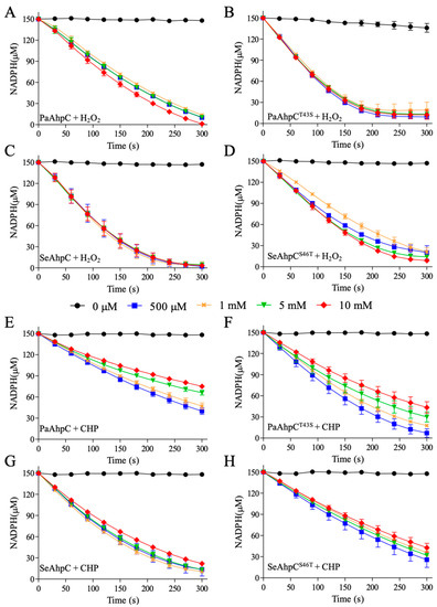 NADPH oxidation assay for evaluation of AhpC hyperoxidation of P. aeruginosa and S. epidermidis using the heterologous E. coli Trx system. Reactions were executed containing PaAhpC (A,E), PaAhpCT43S (B,F), SeAhpC (C,G), or SeAhpCS46T (D,H) (3 µM), EcTrx (6 µM), EcTrxR (0.9 µM), NADPH (150 µM), 50 mM HEPES pH 7.4, 1 mM sodium azide, and 100 µM DTPA. The experiments were started adding growing concentrations of H2O2 (A–D) or CHP (E–H) (0 µM = ● black, 500 µM = ■ blue, 1 mM = × orange, 5 mM = ▼ green and 10 mM = ♦ red). The reactions were incubated for 5 min/37 °C. The oxidation of NADPH was monitored spectrophotometrically at 340 nm. The error bars represent the standard deviations. All experiments were performed in triplicate and repeated at least three times, yielding consistent results.