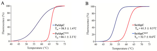 We also evaluated the inactivation of Thr-Prx and Ser-Prx by thermal stress. The differential scanning fluorimetry (DSF) curve for PaAhpC presented a lag phase and the determined Tm was 58.5 ± 1.4 °C, while PaAhpCT44S displayed a sudden increase in the fluorescence and the Tm of 66.1 ± 2.3 °C (Figure 8A). Therefore, replacement of the catalytic triad Thr by Ser resulted in an increase about 8 °C in the Tm (Figure 8A). For SeAhpC and SeAhpCS46T, the shapes of the thermal sigmoidal profiles were very similar, although the Ser to Thr substitution resulted in a decrease of ≈9 °C of the Tm (61.3 ± 0.5 and 52.7 ± 0.6 °C, respectively) (Figure 8B). Therefore, the presence of Ser in the catalytic triad increased the thermal stabilities of the AhpCs.