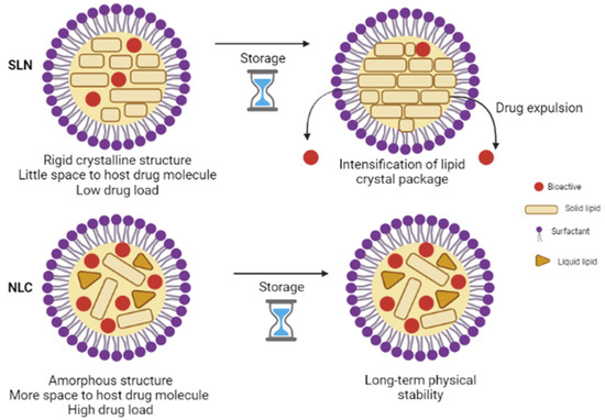 Analogous to SLN, the release mechanism from NLC is governed by several parameters. In addition to those mentioned in the SLN section, the release of the active ingredient is also dependent on the liquid lipid content as its addition reduces the crystallization process of the lipid matrix providing much more flexibility to achieve a desired prolonged-release [56,60,62]. NLC imparts many advantages over SLN (Figure 1). For instance, the potential issues associated with SLN, such as limited loading capacity and expulsion of the active ingredient during storage, are avoided or minimized by the NLC system [63]. Furthermore, ease of production and feasibility of scale-up has led to the fast development of this colloidal system [64,65].