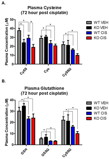 In vehicle treated mice, only CySS was significantly decreased in NHERF1 KO plasma relative to WT plasma (p = 0.0042) (Figure 4A). In response to cisplatin, most small molecular weight thiols in the plasma were significantly decreased when compared to their respective vehicle controls (Cys p = 0.013), (CySSG p = 0.003), (GSH p = 0.02), and (GSSG p = 0.002) (Figure 4A,B). However, only the changes in CySS resulted in a significant difference between cisplatin treated WT and NHERF1 KO animals.