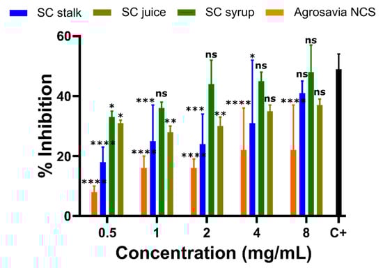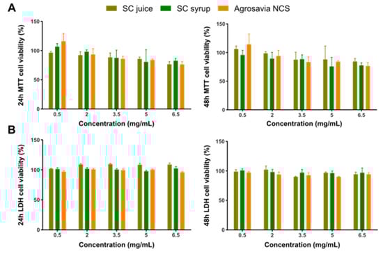 The potential cytotoxic effect of the SC derivatives (SC stalk, SC juice, SC syrup, and Agrosavia NCS) was determined via thiazolyl blue tetrazolium bromide (MTT) and lactate dehydrogenase (LDH) assays. These two techniques allowed us to estimate mitochondrial function and cell membrane integrity, respectively. As shown in Figure 1, none of the evaluated concentrations showed cytotoxic activity after 24 h of exposure by either of the two approaches evaluated. Similarly, after 48 h of exposure, the same trend is observed for the MTT and LDH assay results of all sample concentrations. Statistical analysis showed that there is no statistically significant difference between the treatments.