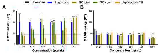 Based on the innocuous effect of the SC derivatives on cell viability, the next step was to evaluate their neuroprotective effectiveness on the PD-induced model (via rotenone) using neuroblastoma cells. We established the optimum experimental conditions of rotenone injury at 150 μM (IC50) of rotenone dover 24 h. According to the MTT results (Figure 2A), treatment with rotenone led to about 60% reduction in viability. At concentrations above 250 μg/mL, SC derivatives (Agrosavia NCS, SC juice, SC syrup, and SC stalk) induced a viability recovery (63.6% to 106.8% of viability at 500 μg/mL) of injured cells. Except for SC syrup, a maximum in recovery was achieved at a concentration of 1000 μg/mL. Importantly, SC derivatives show recovery at all evaluated concentrations. This finding was also confirmed by LDH assays where maximal recovery was observed at a concentration of 1000 μg/mL for all derivatives (i.e., a release of LDH of only about 30% on average compared with 70% for the rotenone control). At such concentration, SC derivatives and Agrosavia NCS appear to have the highest effect. For all the other concentrations, the LDH release approached 45% on average with a slight increase (to about 50%) for Agrosavia NCS at 250 and 500 μg/mL.