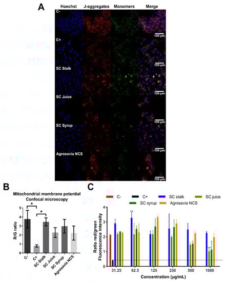 Changes in mitochondrial membrane potential. Negative control (C-): cells without rotenone treatment. Positive control (C+): rotenone. (A) Neuroblastoma (SH-SY5Y) cells were treated with rotenone (150 μM for 24 h). Posteriorly, the cells were washed with PBS 1X and incubated with the SC derivatives (1 mg/mL for 24 h). (B) R/G (Red fluorescence/Green fluorescence). Control (untreated cells) emitted red mitochondrial fluorescence with a small amount of green fluorescence (generated by a decrease in mitochondrial membrane potential) 3.759 ± 0.977 ratio. Cells treated with SC derivatives, where mitochondrial depolarization is generated, but the red fluorescence is still greater than the green one (3.455 ± 0.442 for SC stalk, 2.267 ± 0.537 for SC juice, 2.979 ± 0.758 for SC syrup, and 2.219 ± 0.784 for Agrosavia NCS). A significant decrease in the R/G ratio of the rotenone treatment (positive control) is observed compared to the negative control (healthy cells) and the SC stalk treatment. (C) Fluorescence intensity ratio of aggregates/monomers (red/green) in injured cells (SH-SY5Y neuroblastoma cells treated with rotenone) treated with SC derivatives as a function of concentration. Red and black columns represent healthy cells (negative control) and SH-SY5Y neuroblastoma cells treated with rotenone (positive control), respectively. Results were obtained by the ratio between the red/green fluorescence of the JC-1 dye. The plotted values represent the mean ± SEM of two independent experiments. Statistical analysis was performed by comparing the different treatments with respect to the negative control. (*) corresponds to statistically significant difference with a p-value in the range of 0.01 ≤ p-value ≤ 0.05, while (**) corresponds to statistically significant difference with a p-value in the range of 0.001 ≤ p-value < 0.01. The horizontal dotted line represents the membrane potential of the neuroblastoma cells treated with rotenone (* p-value ≤ 0.05).