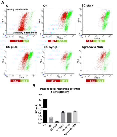 Analysis of mitochondrial membrane potential by flow cytometry on the PD-induced model (SH-SY5Y neuroblastoma cells induced with rotenone) exposed to SC derivatives. Negative control (C-): cells without rotenone treatment. Positive control (C+): rotenone. (A) Flow cytometry histograms of PD-induced model labeled with the JC-1 dye after treatment with SC derivatives. (B) Quantitative red/green ratio of PD-induced model recovery upon exposure to the SC derivatives (1.59 for SC juice, 1.55 for SC syrup, and 1.72 for Agrosavia NCS), except for SC stalk (0.17).