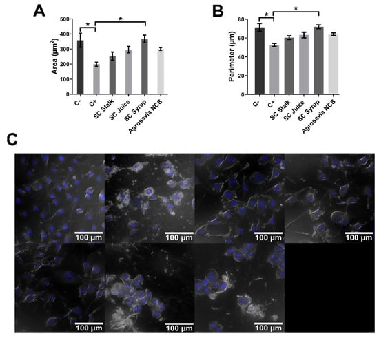 Apoptotic processes were monitored by morphological changes in the nuclei to establish early or late entrance into apoptosis. This was explored with the aid of Hoechst dye, which allows the analysis of morphological changes associated with the beginning of late apoptotic processes [,], represented by changes in parameters such as nuclear area and perimeter [,]. According to literature data, the nuclear area of SH-SY5Y neuroblastoma cells normally varies in a range of 250–350 µm2 []. Figure 6A shows that rotenone led to a decrease in the nuclear area with respect to healthy cells, which confirms the beginning of the apoptotic process induced by the oxidative stress [,,,]. In contrast, the PD-induced model exposed to SC derivatives (SC stalk, juice, and syrup) showed a significant difference in the nuclear area [,] when compared with just rotenone exposure. The SC syrup treatment led to a significantly higher nuclear area with respect to injured cells, which provides further evidence for the protective effect of this derivative [,]. This notion was supported by the calculated nuclear perimeters, where a similar trend was found (Figure 6B). In addition, Figure 6C shows confocal images of SH-SY5Y neuroblastoma cells 24 h after treatment with rotenone (150 μM).