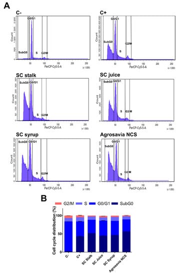 The SC derivatives show radical scavenging activity (as determined by two separate assays), which is most likely due to the presence of phenolic acids and flavonoids (Table 2) [,,]. The difference between the IC50 obtained by the two separate assays, i.e., ABTS and DPHH, is most likely due to the higher sensitivity of the ABTS-based assay []. A notable observation is the superior antioxidant capacity of the SC syrup in comparison with the other derivatives that could be related with the highest concentration of feluric acid. Although, according to the Folin–Ciocalteu method, the pulverized sugarcane (SC stalk) shows high levels of total phenolic compounds, no correlation was found with the scavenging activity. This is most likely due to the presence of additional oxidizable compounds such as cellulose and vegetal proteins, which might not necessarily exhibit radical scavenging activity [,]. The antioxidant activities found for the SC derivatives encouraged us to evaluate their neuroprotective effects. This was accomplished by measuring cytotoxicity, mitochondrial membrane potential, monoaminoxidase B activity, and apoptosis of a PD-induced model (i.e., neuroblastoma cells treated with rotenone) in the presence of the SC derivatives. Interestingly, after exposure to the SC derivatives, cell viability was maintained above about 95% (Figure 1). Additionally, in the PD-induced model, the presence of these compounds reduced cytotoxicity by an average of about 50% (as measured by both MTT and LDH assays) (Figure 2). Figure 2 also confirms that the SC derivatives appear to reverse the mitochondrial complex I (disruption in mitochondrial energy production) damage induced by rotenone. In this regard, similar results were reported by Genovese et al., who demonstrated a potent inhibitory effect toward lipoperoxidation of rat brain homogenates by phenolic extracts obtained from sugarcane juice []. Further evidence of the mitochondrial damage reversal was provided by an increase in the mitochondrial membrane potential (as measured by confocal microscopy images of the JC-1 probe) for the PD-induced model cells treated with SC derivatives (Figure 3). These potential benefits to mitochondrial function are appealing for the development of new treatments of brain injury and neurodegeneration [,]. Additional evidence of such recovery was provided by flow cytometry analyses of JC-1 labeled cells. Except for raw sugarcane (SC stalk), which showed the highest recovery in the confocal experiments, the flow cytometry analyses corroborated mitochondrial membrane potential recovery (Figure 4). This surprising result might be explained by the fact that, in confocal microscopy, only the fluorescence emitted by mitochondria is taken into account [] while, in flow cytometry, this fluorescence is altered by changes in morphology of the whole cell []. These morphological changes are generated by apoptotic processes and are generally observed in times shorter than those required to observe membrane potential changes []. This strongly suggests that cells exposed to sugarcane may have entered late apoptosis processes []. These results are also supported by the high percentage of cells in Sub G0 phase after treatment with sugarcane (Figure 7A,B). Intracellular inhibition of MAO-B was increased when the PD-induced model cells were treated with high concentrations of SC derivatives.