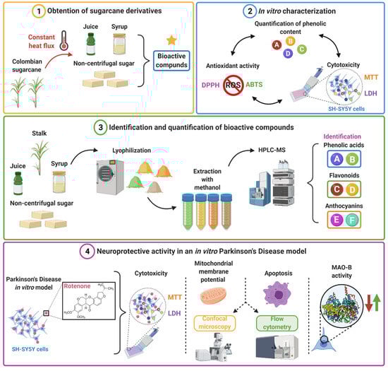 Illustration of the developed workflow for validating SC derivatives as highly-accessible therapeutic agents for the delay of neurodegeneration in PD (Created with Biorender.com, accessed 1 June 2021). (1) The sugarcane is processed by a thermally controlled process to obtain juice, syrup, and NCS containing the bioactive compounds. (2) A preliminary characterization of biological response is conducted in vitro that included assays for antioxidant activity, phenolic content, and cytotoxicity. (3) Bioactive compounds were extracted by methanolic extraction and, subsequently, analytical HPLC-MS were carried out for identification and quantification. (4) The neuroprotective activity of SC derivatives was evaluated in vitro in a rotenone-induced model via mitochondrial membrane potential, apoptosis, and MAO-B activity.