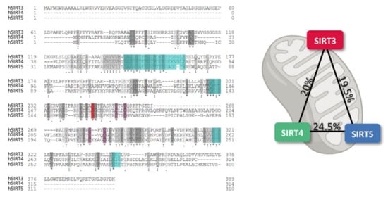 Multiple alignment with sequence similarities (grey), nucleotide binding sites (cyan), zinc-binding residues (purple), and active sites (red), shared by human mtSIRTs (hSIRT3-5) (left panel), and identity percentages among hSIRT3-5, as calculated by Clustalo (right panel).