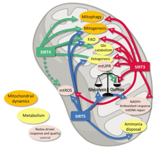Until 2007, little was known about the biological functions of mtSIRTs [21], however, today we know that mtSIRTs are regulators of metabolic homeostasis by promoting PTMs of many protein targets [14,22]. Interestingly, the activity and expression of mtSIRTs are regulated by transcriptional and post-transcriptional mechanisms, including miRNAs [23].