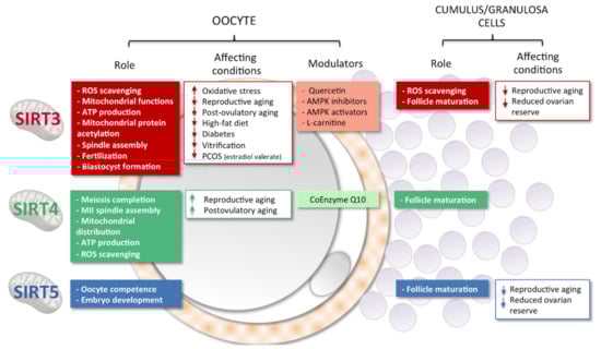 Role of mtSIRTs in oocytes and somatic companions, cumulus cells (CCs) and granulosa cells (GCs) are summarized. Conditions affecting the activity of mtSIRTs and possible beneficial intervention based on media supplementation are listed.