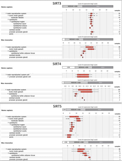 The testes are among the adult organs where the high levels of mRNA expression of all sirtuin genes were observed [15]. Since the role of mtSIRTs in male reproduction remains poorly investigated, we have considered relevant to perform an in silico gene expression analysis using GENEVESTIGATOR software [137] (https://genevestigator.com/gv/index.jsp, access date 28 April 2021). The Sirt3, Sirt4, and Sirt5 genes were given as input in the anatomy tool and a data in the form of boxplot-tree were generated (Figure 5). The expression potential represents the normalized expression value for a gene across all experiments available in the database. In the male reproductive system, and more specifically in the testis, Sirt3 is more expressed than Sirt4 and Sirt5 in both humans and mice: Sirt3 is expressed at high level, whereas Sirt4 and Sirt5 are expressed at a medium level. Sirt4 expression is reported to be higher in the mouse than in humans.