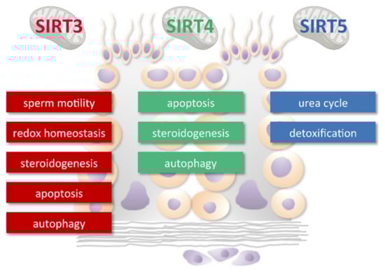 In 2015, Sirt5 was reported to be expressed in the cytosol of mouse spermatogonia, spermatocyte, and round spermatid [148]. Based on the control of CPS1 by SIRT5, [15,77], this sirtuin was able to play a role in the regulation of mitochondria and physiological stress during spermatogenesis by acting as a regulator of urea cycle and detoxification.