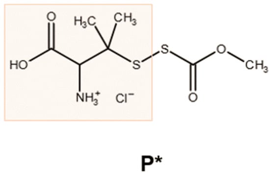 Chemical structure of P*. The reaction of penicillamine (orange box) with methoxycarbonylsulfenyl chloride generates the ammonium salt P*, which decomposes in the presence of thiols, leading to the generation of H2S and polysulfides [].