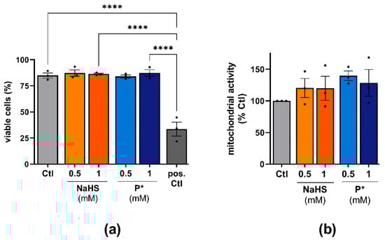 P* was synthesized as previously reported []. Stock solutions of NaHS and P* were prepared in H2O. To decompose P*, P* was diluted in cell culture medium in the required concentrations in the presence of the equimolar concentrations of l-cysteine and was left uncapped overnight at 37 °C to allow for the evaporation of H2S. EDTA, l-cysteine, Igepal CA-630, NaHS, N-acetyl cysteine (NAC), neocuproine, and RIPA buffer were purchased from Sigma-Aldrich (Vienna, Austria). Complete Protease InhibitorTM Cocktail and PhosSTOPTM Phosphatase Inhibitor Cocktail were purchased from Roche Life Science (Vienna, Austria). Hydroethidine was obtained from Calbiochem (Merck4Biosciences, Darmstadt, Germany). All antibodies were purchased from Cell Signaling Technology Europe (Leiden, The Netherlands). The detailed antibody list is readily provided by the authors upon request. If not otherwise stated, all other substances were obtained from MedChemExpress (THP Medical Products, Vienna, Austria).