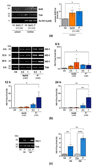 We further assessed the expression of the Nrf2 target gene HO-1 in response to NaHS and P* throughout the 24 h period. Both H2S donors strongly induced HO-1 expression compared to untreated cells (Figure 4b, uncropped blots are presented in Supplementary Figure S3). In the case of NaHS, HO-1 expression was maximal after 6 h of incubation and declined to control levels after 12 h. In contrast to NaHS, P*-induced HO-1 expression peaked at 12 h and was still highly elevated after 24 h of incubation.