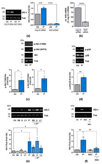 P*-mediated HO-1 induction requires activation of Nrf2, PI3K/Akt, and p38 MAPK pathways. (a) ATDC5 cells transfected with Nrf2 (Nrf2 siRNA) or negative control (neg ctl siRNA) siRNA were preincubated with 0.5 mM P* for 6 h. Expression of HO-1 was analyzed by Western blotting using α, β-tubulin (Tub) as control. Representative Western blots are shown. Densitometry analysis values of HO-1 were normalized against Tub and expressed as relative quantity compared to untreated cells (Ctl) set to 1, n = 3, *** p < 0.001, **** p < 0.0001. (b) Knockdown efficiency of Nrf2 by siRNA was validated by qPCR with cyclophilin D as a reference gene, n = 3, **** p < 0.0001. (c,d) ATDC5 cells were incubated with 0.5 mM P* for 6 h, and protein expression was analyzed through Western blotting. Representative Western blots of the expression of (c) p-Akt, Akt and Tub or (d) p-p38, p38 MAPK and Tub are shown. Densitometry analysis values of phosphorylated proteins were normalized against equivalent unphosphorylated proteins and then compared to untreated cells (Ctl) set to 1, n = 3, * p < 0.05, ** p < 0.01 (unpaired t-test). (e,f) Representative Western blots of the expression of HO-1 and Tub. Densitometry analysis values of HO-1 were normalized against Tub and expressed as relative quantities compared to Ctl set to 1, n = 3, * p < 0.05, ** p < 0.01. ATDC5 cells were incubated for 1 h with (e) p38 MAPK inhibitor SB203580 (SB, 10 µM), MEK1/2 inhibitor U0126 (U, 10 µM), or PI3K inhibitor LY294002 (LY, 10 µM), or (f) 2 mM N-acetylcysteine (NAC), followed by 6 h incubation with 0.5 mM P*.