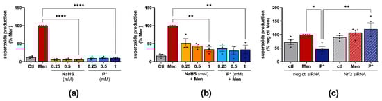 Antioxidative effects of P*. Ctl = untreated cells, representative fluorescence images of superoxide measurement are presented in Supplementary Figures S8 and S9. (a) Superoxide production in response to NaHS or P* was measured in ATDC5 cells and normalized to menadione (Men) set to 100%, n = 4, **** p < 0.0001. (b) Superoxide production in response to 24 h NaHS or P* followed by 4 h Men (50 µM), normalized to Men (100%). n = 3, ** p < 0.01. (c) ATDC5 cells transfected with Nrf2 (Nrf2 siRNA) or negative control (neg ctl siRNA) siRNA were preincubated with 1 mM P* for 24 h. After 4 h of incubation with Men (50 µM), superoxide production was measured and normalized to neg ctl Men set to 100%, n = 4, * p < 0.05, ** p < 0.01.