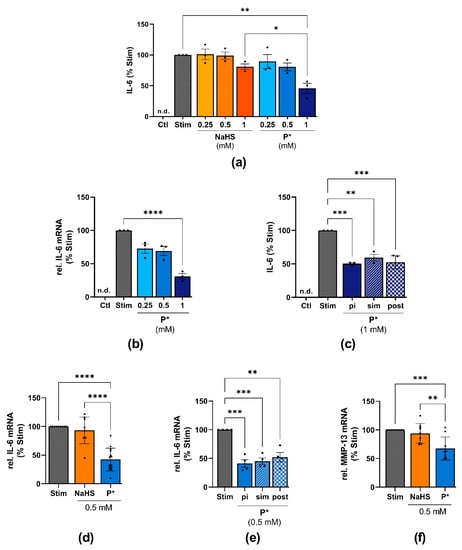 Effects of P* on IL-6 expression in ATDC5 cells and primary human chondrocytes. Ctl = untreated cells, n.d. = non-detected; significance is only shown for the highest concentrations used. (a) ATDC5 cells were treated with the indicated concentrations of NaHS or P* for 1 h followed by 24 h of stimulation with IL-1β/IFN-γ. IL-6 levels were assessed by ELISA and normalized to stimulated cells (Stim) set to 100%, n = 3, * p < 0.05, ** p < 0.01. (b) ATDC5 cells were incubated with P* for 1 h and stimulated for 24 h. IL-6 mRNA levels were determined by qPCR with cyclophilin D as a reference gene and normalized to Stim set to 100%, n = 3, **** p < 0.0001. (c) ATDC5 cells were incubated with 1 mM P* 1 h before (pi), simultaneously (sim), or 1 h after (post) 24 h of stimulation with IL-1β/IFN-γ. IL-6 levels were assessed by ELISA and normalized to Stim (100%), n = 3, ** p < 0.01, *** p < 0.001. (d) Primary human chondrocytes from OA patients were preincubated for 1 h with 0.5 mM NaHS or P* and stimulated for 24 h with IL-1β. IL-6 mRNA levels were determined by qPCR with SDHA as a reference gene and normalized to Stim (100%). NaHS: n = 9, P*: n = 14, **** p < 0.0001. (e) Primary human chondrocytes from OA patients were incubated with 0.5 mM P* 1 h pi, sim, or post 24 h of stimulation with IL-1β. mRNA levels were determined by qPCR with SDHA as a reference gene and normalized to Stim (100%), n = 4, ** p < 0.01, *** p < 0.001. (f) Primary human chondrocytes from OA patients were preincubated for 1 h with 0.5 mM NaHS or P* and stimulated for 24 h with IL-1β. MMP-13 mRNA levels were determined by qPCR with SDHA as a reference gene and normalized to Stim set to 100%, n = 9, ** p < 0.01, *** p < 0.001.