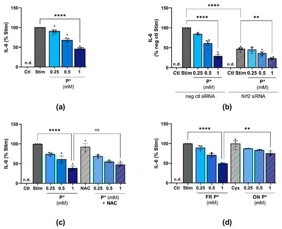 To evaluate whether P* could decrease IL-6 levels in the absence of HO-1, we inhibited HO-1 induction by Nrf2 siRNA. Surprisingly, Nrf2 silencing significantly diminished IL-6 production (p < 0.0001) and P* further augmented the observed decline (p = 0.0012), (Figure 8b). In addition, co-incubation of P* with NAC did not significantly affect the P*-mediated IL-6 decrease (1 mM P*: 38.8 ± 5.1% vs. co-incubation with NAC: 47.8 ± 3.8%, p > 0.5) (Figure 8c), although in previous experiments, NAC had abolished P*-mediated HO-1 induction (see Figure 5f).