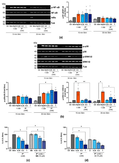 Influence of P* on NF-κB and MAPK signaling pathways. Ctl = untreated cells, n.d. = non-detected. (a,b) ATDC5 cells were incubated with NaHS or P* for 1 h and stimulated with IL-1β/IFN-γ for 15 or 30 min. Representative Western blots of (a) p-NF-κB, NF-κB, IκBα, and α, β-tubulin (Tub), or (b) p-p38, p38 MAPK, p-ERK1/2, ERK1/2, and Tub expression. Densitometry analysis values were normalized against (a) Tub or (b) the equivalent unphosphorylated protein, respectively, and then compared with stimulated cells (Stim) set to 1, n = 3. p-values for all concentrations are shown, * p < 0.05, ** p < 0.01. (c,d) ATDC5 cells were treated with (c)10 µM SB203580 (SB) or (d) 10 µM U0126 (U) for 1 h and subsequently with the indicated concentrations of P* for 6 h. The medium was exchanged, and the cells were stimulated for 24 h with IL-1β/IFN-γ. IL-6 levels were assessed by ELISA and normalized to Stim (100%), n = 3, * p < 0.05.