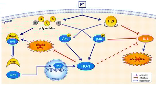 Schematic summary of P*-mediated biological effects. In aqueous buffers, P* generates a metastable persulfide and a mixture of polysulfides as end-products []. Upon entry into the cell, P* also releases H2S in the presence of thiols such as cysteine or glutathione. Sulfhydration of proteins is mainly carried out by polysulfides, leading to the activation of Nrf2/HO-1 dependent antioxidant pathways. P* also induces HO-1 via the regulation of Akt and p38 MAPK. Apart from antioxidant effects, P* also shows anti-inflammatory properties such as the inhibition of IL-6 for which H2S and p38 MAPK seem to be responsible.