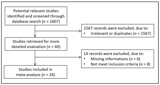 A flow chart describing the screening process is presented in Figure 1. The systematic search initially identified 1607 studies. After the first screening, 1567 were excluded because they were either duplicates or irrelevant. After a full-text revision of the remaining 40 articles, 14 were further excluded because of missing information or non-compliance with the inclusion criteria. Thus, 26 studies in 1233 OSA patients (mean age 49 years, 82% males) and 716 controls (mean age 48 years, 76% males) published between 2005 and 2018 were included in the meta-analysis (Table 1) [17,28,29,30,31,32,33,34,35,36,37,38,39,40,41,42,43,44,45,46,47,48,49,50,51,52]. The study by Wang L. et al. 2010 [34] divided OSA patients into two groups according to age (elderly and non- elderly patients). Therefore, this study was analyzed by considering the two groups separately in the following manner: (a) elderly and (b) non-elderly.