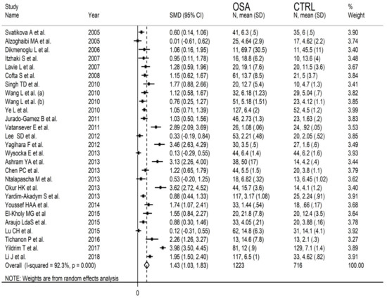 In order to assess the differences in MDA concentrations between OSA and non-OSA subjects, standardized mean differences (SMD) were measured to set up forest plots of continuous data. The test was considered statistically significant when the P value was <0.05 and 95% confidence intervals (CIs) were reported. If necessary, the mean and standard deviation were extrapolated from the median and interquartile range, as previously reported by Wan et al. [19], from the median and range, as described by Hozo et al. [20], or from individual graphs using the Graph Data Extractor software. Heterogeneity of SMD across studies was examined using the Q statistic (the significance level was set at p < 0.10). The inconsistency between studies was quantitatively measured by I2 statistic (I2 < 25%—no heterogeneity; I2 between 25% and 50—moderate heterogeneity; I2 between 50% and 75%—large heterogeneity; I2 > 75%—extreme heterogeneity) [21,22]. Statistical heterogeneity was defined as an I2 statistic value ≥50% [22]. A random-effects model was used if the heterogeneity was high. Additionally, a sensitivity analysis was performed to test the influence of each study on the overall risk estimate by excluding one study at a time [23]. The presence of publication bias was evaluated by the analysis of the relation between study size and magnitude of effect using the Begg’s adjusted rank correlation test and the Egger’s regression asymmetry test at the p < 0.05 level of significance [24,25]. The presence of publication bias was further tested and eventually corrected using the Duval and Tweedie “trim and fill” procedure [26]. Confidence intervals at 95% (CIs) were reported for each effect size and the overall effect and p < 0.05 indicated statistical significance. Statistical analyses were performed using Stata 14 (STATA Corp., College Station, TX, USA). The study followed the principles defined in the PRISMA statement for reporting systematic reviews and meta-analyses [27].