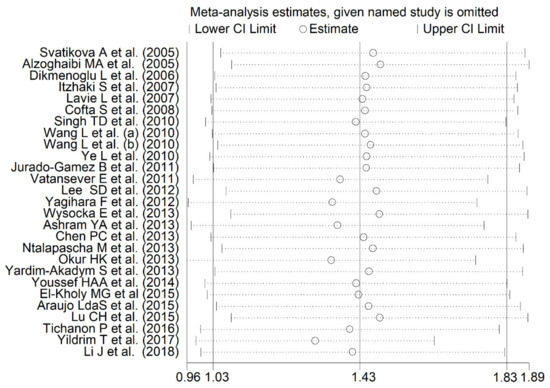 - Tobias, A. Assessing the influence of a single study in the meta-analysis estimate. Stata Tech. Bull. 1999, 47, 15–17. [Google Scholar]