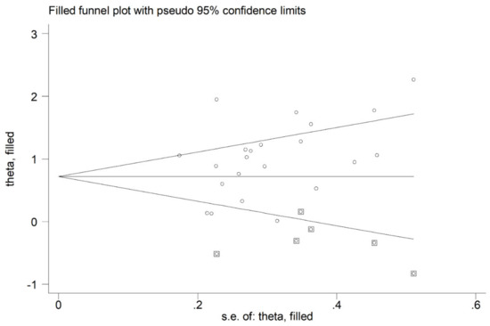 MDA concentrations in the included studies and the forest plot for MDA levels in OSA patients and controls are reported, respectively, in Table 2, Supplementary Figure (Figure S1) and Figure 2. In all studies, OSA patients had higher MDA concentrations compared to the controls (mean difference range, 0.01 to 3.98), although the difference was not statistically significant in five of the studies [28,38,40,43,49]. Our analysis revealed a substantial heterogeneity between studies (I2 = 92.3%, p < 0.001). Thus, random-effects models were used. Overall, pooled results showed significantly higher MDA levels in patients with OSA (SMD 1.43, 95% CI 1.03 to 1.83, p < 0.001). The corresponding pooled SMD values were not altered when each study was consecutively removed as shown by sensitivity analysis (effect size range, between 1.31 and 1.49, Figure 3). The funnel plot (Figure 4) indicated a possible distortive effect of five studies on the right side of the graph [37,39,41,44,51]. Their exclusion attenuated both the effect size (SMD 0.98, 95% CI 0.73 to 1.22, p < 0.001) and the heterogeneity (I2 = 76%, p < 0.001). Analysis of the remaining studies showed a trend toward publication bias, as indicated by the Begg’s (p = 0.04) and Egger’s (p = 0.16) test. Accordingly, the trim-and-fill method revealed six potential missing studies to be added to the left side of the funnel plot to obtain symmetry (Figure 5). The resulting SMD remained significant despite the further attenuation (SMD 0.73, 95% CI 0.46 to 0.99, p < 0.001).