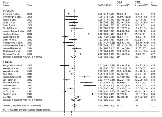 Forest plot of studies examining MDA concentrations in OSA and in controls according to the type of biological sample (plasma or serum).