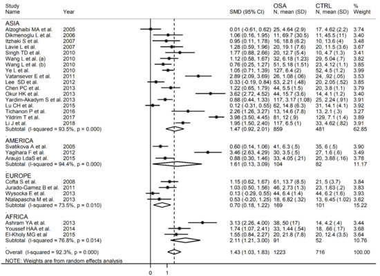 In order to explore possible sources of heterogeneitywe investigated, by meta-regression analysis, the effects of different study characteristics including between-group difference in age, gender, body mass index (BMI), publication year, continent where the study was conducted (Europe, Africa, Asia and America), biological sample (plasma or serum), assay type used (spectrophotometric, high-performance liquid chromatography (HPLC) or enzyme-linked immunosorbent (ELISA)), low density lipoprotein (LDL), high density lipoprotein (HDL), total cholesterol (TC), triglyceride (TG) and glucose concentrations and measures of OSA severity (apnea-hypopnea index, AHI). Extreme heterogeneity was observed both in studies reporting serum (I2 = 95.7%, p < 0.001) and plasma (I2 = 80.6%, p < 0.001) concentrations, although the between-study variance was relatively lower in the latter (Figure 6). In meta-regression analysis, non-significant differences (t = 0.78, p = 0.44) in SMD values were observed between plasma (SMD 1.26, 95% CI 0.89 to 1.62, p < 0.001) and serum (SMD 1.63, 95% CI 0.89 to 2.37, p < 0.001) concentrations. Similarly, non-significant differences (t = 0.09, p = 0.93) in pooled SMD values were observed across Asian (SMD 1.47, 95% CI 0.92 to 2.01, p < 0.001), American (SMD 1.61, 95% CI 0.13 to 3.09, p < 0.001), European (SMD 0.70, 95% CI 0.18 to 1.22, p = 0.001) and African studies (SMD 2.11, 95% CI 1.21 to 3.00, p < 0.001) (Figure 7). However, a relatively lower heterogeneity was observed in African (I2 = 76.8%, p = 0.014) and European studies (I2 = 73.5%, p = 0.010). Gender (t = −0.10, p = 0.92), BMI (t = −0.41, p = 0.69), TC (t = −0.01, p = 0.99), LDL (t = −0.09, p = 0.93), HDL (t = 0.84, p = 0.42), TG (t = −0.71, p = 0.49) and glucose (t = 0.75, p = 0.47) were not associated with the SMD. Conversely, age (t = −2.06, p = 0.049), assay type (t = 2.31, p = 0.03) and publication year (t = 2.08, p = 0.048) were significantly associated with the SMD.