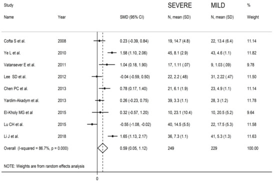 In order to evaluate the relationship between effect size and disease severity we performed a meta-analysis in a sub-group of nine studies reporting MDA concentrations in groups with different disease severity [32,35,37,38,42,45,47,49,52]. The forest plot for MDA concentrations in mild and severe OSA patients is reported in Figure 8. In two studies, patients with mild disease displayed significantly higher MDA values when compared to those with severe form (mean difference range, −0.04 to −0.55) [39,49]. By contrast, in the remaining seven studies, the MDA value was found to be higher in patients with severe disease (mean difference range 0.63 to 1.65), with a significant difference in four studies [35,37,42,52]. The pooled results showed that MDA concentrations were significantly higher in patients with severe disease (SMD 0.59; 95% CI 0.05 to 1.12, p = 0.03; I2 = 86.7%, p < 0.001) when compared with mild disease.