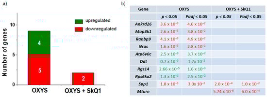 The effects of the dietary supplementation with SkQ1 in OXYS rats on the expression of the genes whose products play a role in the ERK1/2 SP (a). Differentially expressed genes of the ERK1/2 SP in untreated (control) OXYS rats and the influence of prolonged treatment with SkQ1 (b). Differential expression means a comparison with the parental control strain (Wistar). The data are marked in green if upregulated and red if downregulated of genes. p: probability values; padj: adjusted p values.