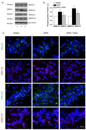 As displayed in Figure 2a,b, the supplementation with SkQ1 decreased the phosphorylation of MEK1/2 in OXYS rats. Statistical analysis indicated that the decrease in the ratio of p-MEK1/2 to total MEK1/2 was due to a significant decrease in the level of MEK1/2 (p < 0.05, Figure 2a). Similar results were obtained after the immunostaining of rat brains (Figure 2c).