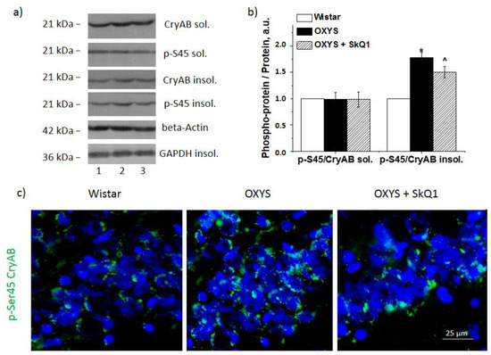 The effect of SkQ1 supplementation in OXYS rats from age 12 to 18 months on the protein levels of CryaB and p-Ser45-CryaB in the hippocampus. Representative Western blots of total and phosphorylated CryaB and p-Ser45-CryaB in the detergent-soluble and detergent-insoluble fractions from the hippocampus of untreated Wistar (1) and OXYS rats (2) and OXYS rats treated with SkQ1 (3) (a). Graphical presentation of the ratios of proteins p-Ser45-CryaB to CryaB in the hippocampus of untreated Wistar and OXYS rats and OXYS rats taking SkQ1 after normalization to beta-actin for the detergent-soluble protein fraction and to GAPDH for the detergent-insoluble fraction (b). Data are presented as mean ± SEM of five independent experiments. Immunostaining for p-Ser45-CryaB (c) in the hippocampus of untreated Wistar and OXYS rats and OXYS rats taking SkQ1. The nuclei were stained with DAPI (blue). Scale bars: 25 µm. ^ Statistically significant differences between the strains of the same age; * the effect of supplementation with SkQ1 (p < 0.05). sol.: detergent-soluble protein fraction of hippocampus; insol.: detergent-insoluble protein fraction.