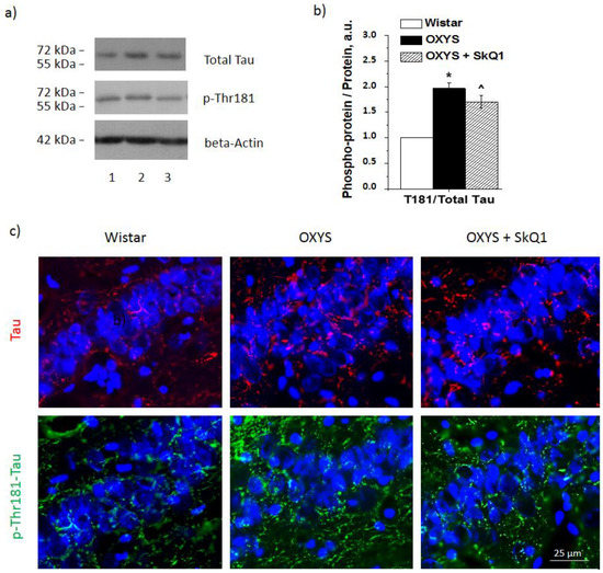 According to Western blot findings, OXYS rats after the supplementation with SkQ1 showed significantly lower expression of total tau and p-Thr181-tau (p < 0.05 and <0.01, respectively; Figure 4a,b). The Western blotting data were confirmed by immunostaining results (Figure 4c).