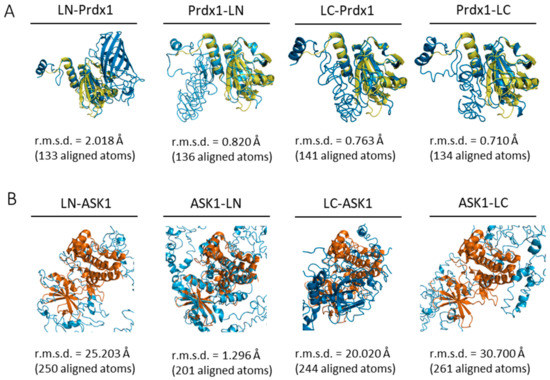 All ab initio Prdx1-mLumin models and the ASK1-LN model maintain the structural fold of Prdx1 and ASK1. Prdx1- and ASK1-mLumin ab initio models were superimposed with the human Prdx1 C83S mutant (PDB ID: 4XCS) andthe human ASK1 kinase domain (PDB ID: 2CLQ). (A) All Prdx1-mLumin ab initio models (blue) showed a low r.m.s.d. value with human Prdx1 C83S mutant (PDB: 4XCS) (yellow). (B) Only the ASK1-LN ab initio model (blue) showed a superimposition with a relatively low r.m.s.d. value with human ASK1 kinase domain (PDB ID: 2CLQ) (orange). The r.m.s.d. value is displayed for each superimposition. Superimpositions were done in PyMol (Version 2.4.1, Schrödinger, Inc., New York, USA) [40]. LN: large N-terminal half of mLumin. LC: small C-terminal half of mLumin.