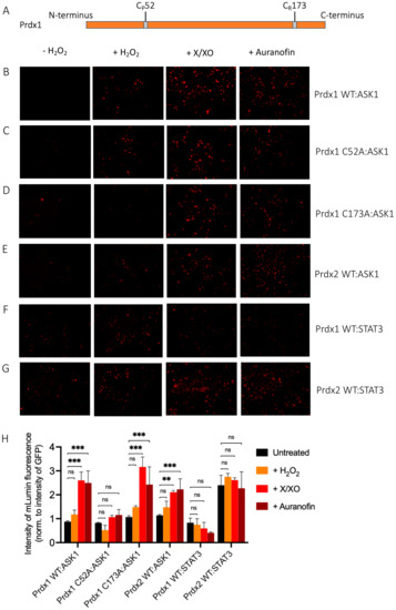 Prdx1 (WT, C52A, and C173A) and Prdx2 WT interact with ASK1 in HEK293 MSR. The fluorescent signal (red dots) emitted by the mLumin protein upon protein complementation (i.e., upon the interaction of the ASK1-LN and Prdx1-LC proteins) in live HEK293 MSR cells is shown. (A) The locations of critical cysteine residues of Prdx1. BiFC signal upon (B) Prdx1 WT:ASK1, (C) Prdx1 C52A:ASK1, (D) Prdx1 C173A:ASK1, (E) Prdx2 WT:ASK1, (F) Prdx1 WT:STAT3, and (G) Prdx2 WT:STAT3 interaction. The treatments from left to right were: no treatment, 100 µM H2O2 for 30 min, X/XO (8 µM X and 1 mU/mL XO) for 18 h, and 0.8 µM auranofin for 18 h. (H) Quantified mLumin/GFP values in HEK293 MSR cells (from Figure 3B–G); Prdx1 WT:STAT3 and Prdx2 WT:STAT3 were the respective negative and positive controls. All images were captured with the total magnification of 100×. The GFP images used for normalization are presented in Figure S2. The results are representative of n = 3 independent experiments. All bar charts in this figure represent the mean ± SD. ** p ≤ 0.01; *** p ≤ 0.001; ns not significant; based on an unpaired ANOVA test.