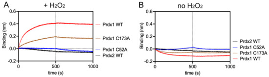 After protein purification and Prdx quality assessment, we studied the binding kinetics of the Prdx1:ASK1-TBD interaction by bio-layer interferometry (BLI). Specifically, we determined the kon and koff values of Prdx1 WT and mutants to ASK1-TBD. Experimentally, MBP-ASK1-TBD was tethered to the sensor-tip via its 6x-His tag and the different Prdx1 variants were added at increasing concentrations in the presence of 10 µM H2O2. As can be seen in Table 3, Figure 4A, and Supplementary Figure S5A,B, in these conditions, Prdx1 WT and Prdx1 C173A interacted with ASK1-TBD, while no interaction was seen for Prdx1 C52A or Prdx2, contrary to our observations in cells (Figure 3C,E). It should be noted, however, that the absence of a resolving cysteine (C173) also affected the interaction, as it had a slightly lower kon value (Table 3). To rule out the possibility that these differences in the interaction with ASK1-TBD were due to possible structural distortions caused by the C173A and C52A mutations in Prdx1, we assessed the secondary structure of Prdx1 WT and its variants by circular dichroism (CD) in both reduced and oxidized states (Supplementary Figure S6A,B). In both cases, the secondary structure of the two Prdx1 mutants was maintained and similar spectra to the Prdx1 WT were obtained.