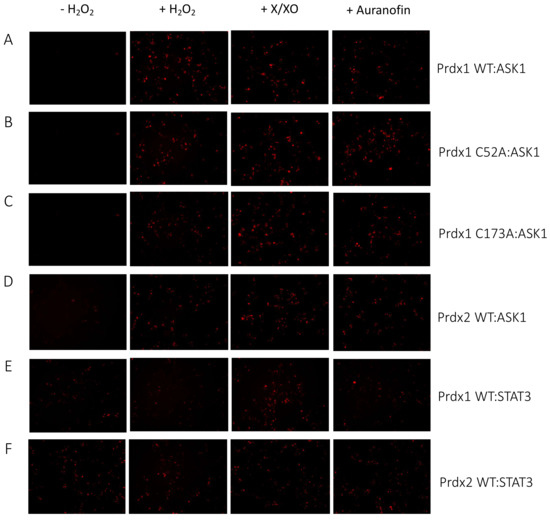 The ASK1-LN and Prdx1-LC constructs selected from our in silico modeling were transiently co-transfected into HEK293 MSR cells. An expression construct for GFP was co-transfected as a third plasmid for normalization purposes. Apart from the Prdx1 WT, we also performed BiFC on ASK1-LN with the peroxidatic (C52A) and resolving (C173A) mutants of Prdx1-LC (Figure 3A). We used several ways to increase intracellular H2O2 levels, which differed by the duration of the treatment and the place of H2O2 generation/application. These were a short bolus of 100 μΜ H2O2 for 30 min, a combination of xanthine/xanthine oxidase (X/XO) for 18 h, which generated extracellular H2O2 that then entered cells via aquaporins, and the thioredoxin reductase inhibitor auranofin (also for 18 h). As the thioredoxin system reduces peroxiredoxins, its inhibition would inevitably lead to a build-up of oxidized peroxiredoxins, and therefore, an accumulation of endogenous H2O2. We employed these longer treatments, as treatment of cells with bolus doses of peroxide could result in artifactual oxidation. As can be seen in Figure 3B, in the absence of H2O2, we observed no fluorescence, whereas all three conditions that lead to an increase in H2O2 levels led to substantial fluorescence complementation with the longer treatments (X/XO and auranofin) resulting in up to 3-fold higher fluorescence than a bolus of H2O2 (Figure 3B,H). This finding suggests that Prdx1 WT interacts with ASK1 only upon the exposure of cells to H2O2, unlike the Prdx2:STAT3 interaction, which occurs independently of and prior to exposure to H2O2 [35].