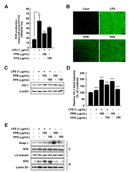 Intracellular ROS were measured using 2′,7′-dichlorofluorescein diacetate (DCF-DA) with a fluorescence reader and fluorescence microscopy. RAW264.7 cells were seeded at 1 × 105 cells/mL in a 96-well plate and cultured overnight. Cells were pre-treated with PPB and PPS and then stimulated with LPS for 24 h. After washing with 200 μL PBS, cells were incubated with 20 μM DCF-DA in serum-free media for 30 min. The dye solution was discarded and the cells were washed twice. ROS production was measured at an excitation wavelength of 485 nm and an emission wavelength of 530 nm using a fluorescence reader (Molecular Devices, CA, USA). Cellular ROS were measured by fluorescence microscopy (Leica, Wetzlar, Germany) using LAS X microscope software (Leica).