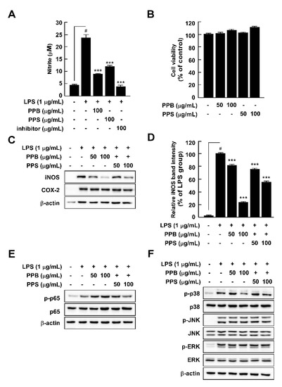 RAW264.7 cells were seeded at 2 × 105 cells/mL on a 96-well plate and cultured overnight in an incubator at 37 °C with 5% CO2. The medium was replaced with medium containing PPB and PPS for 24 h and then 10 μL of 5 mg/mL MTT solution (Sigma-Aldrich) was added to each well. After incubation for 4 h, the supernatant was discarded and then cells were dissolved with 100 μL of dimethyl superoxide (Sigma-Aldrich). Cell viability was measured with a microplate reader (Bio-Rad Inc., Hercules, CA, USA) at 595 nm.