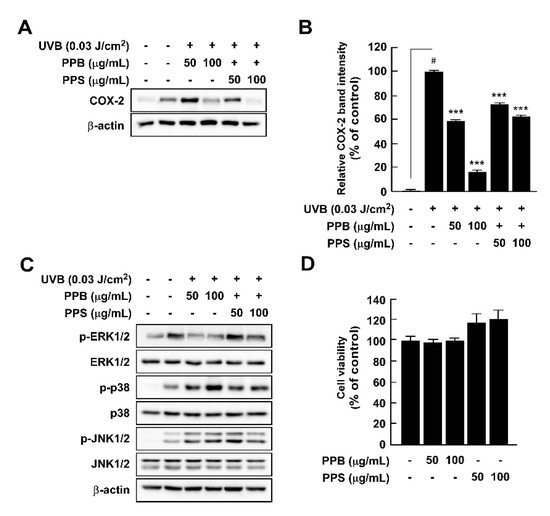 Effects of pink pepper extract (PPE) on UVB-induced COX-2 expression and MAPK phosphorylation in HaCaT cells. (A) PPE suppressed UVB-induced COX-2 expression in HaCaT cells. Cells were treated with the indicated concentration of PPE for 1 h and then stimulated with UVB (0.03 J/cm3) for 4 h. (B) Quantification of COX-2 expression by PPB and PPS. (C) PPE suppressed UVB-induced phosphorylation of ERK1/2, but not p38 and JNK1/2. Cells were treated with PPE for 1 h and then stimulated with UVB (0.03 J/cm3) for 30 min. (D) PPB and PPS did not affect the cell viability at the tested concentrations. The cells were treated with increasing concentration of PPB and PPS for 24 h. Phosphorylated MAPK and COX-2 expression were detected by Western blot. Data are presented as mean ± standard deviation of three independent experiments. # p < 0.05 between control and LPS-exposed cells (no PPE); *** p < 0.001.