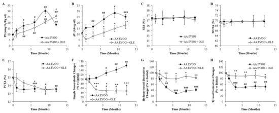 Levels of hydroxytyrosol and tyrosol derivatives decreased in the AA:EVOO mixture from the first month of storage on (p < 0.05), with this reduction being higher over time (p < 0.01). On the contrary, the levels of hydroxytyrosol and tyrosol derivatives in AA:EVOO + OLE did not change during the storage process (Figure 1G,H).