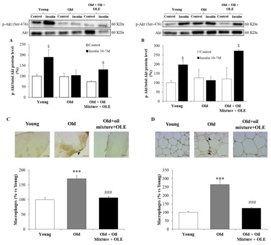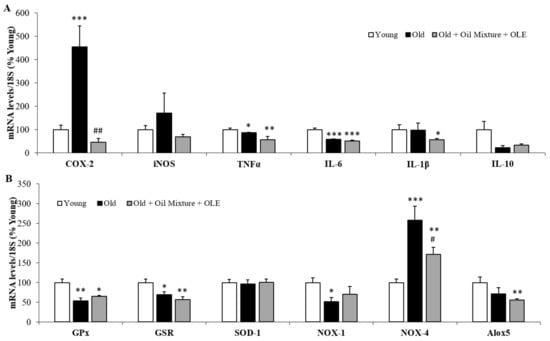 Aging was associated with a significant increase in the circulating levels of total lipids (p < 0.05), triglycerides (p < 0.05), total cholesterol (p < 0.05), LDL-cholesterol (p < 0.01), insulin (p < 0.01), leptin (p < 0.01) and adiponectin (p < 0.001). Likewise, the HOMA-IR was also higher in older rats than in young rats (p < 0.05). Supplementation with the oil mixture + OLE prevented the age-induced increase in HOMA-IR (p < 0.05), total lipids (p < 0.01), triglycerides (p < 0.05), total (p < 0.01) and LDL-cholesterol (p < 0.001) and further increased the serum levels of adiponectin (p < 0.01) (Table 3).
