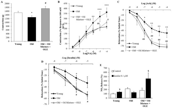 Half of the old rats (Old) and young rats were administered with water for 21 days while the other half of old rats were (Old + Oil Mixture + OLE) administered with OLE in drinking water and treated orally with 2.5 mL/Kg of the Oil Mixture (75% of EVOO and 25% of AO) once daily. In order to avoid degradation, OLE was renewed every 3 days and the dosage was adjusted to the liquid intake and the animal’s body weights.