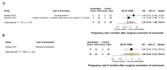 Based on data availability, we undertook an inverse variance, random effects meta-analysis of odds ratios (ORs) to determine the pregnancy rate after antioxidant supplementation versus no treatment in patients undergoing surgical repair of varicocele at three and six months of treatment. Accordingly, we performed an inverse variance, random effects meta-analysis of weighted mean differences (WMDs) in patients undergoing surgical repair of varicocele to determine the effect of antioxidant supplementation versus no treatment or placebo on semen parameters (concentration, motility, morphology, and DNA fragmentation) at three and six months of treatment. For this purpose, we also conducted a subgroup analysis based on the comparator arm (antioxidant supplementation versus placebo or no treatment).