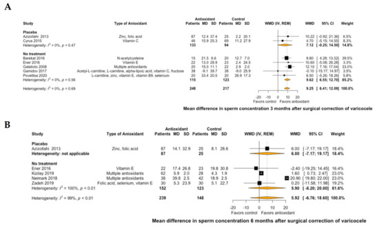 Forest plot of mean difference in sperm concentration at 3 months (A) and 6 months (B) after treatment with antioxidants versus placebo or no treatment in patients with surgical correction of varicocele. CI: confidence interval; IV: inverse variance; MD: mean difference; REM: random effects model; SD: standard deviation; WMD: weighted mean difference.